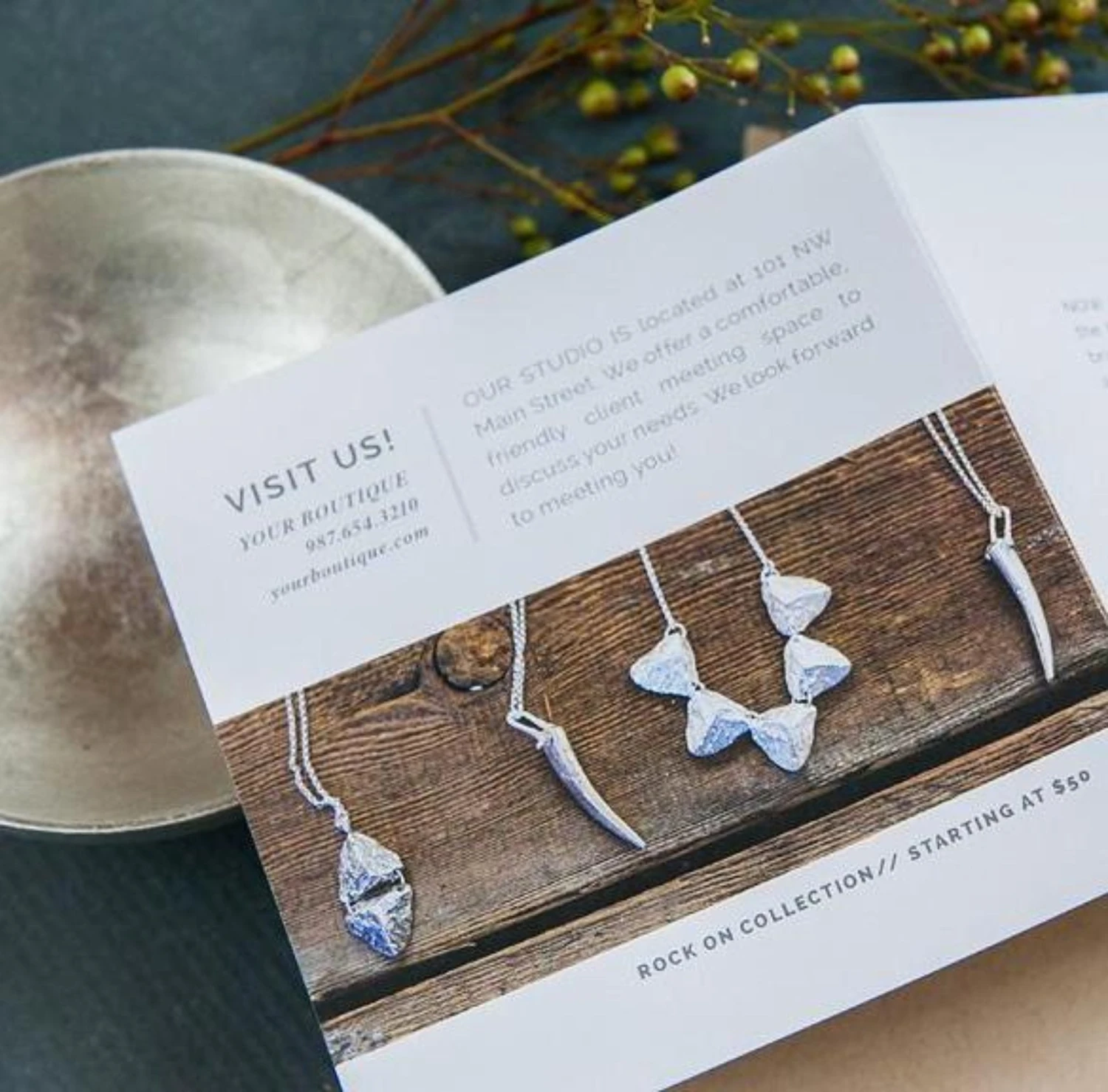 Our Boutique Marketing Suite presents your boutique business with impeccable style. Flawless design showcases images of your products in this clean collection. Each piece also includes professionally written text such as a welcome greeting, your boutique story, and a section for press. All text is customizable to perfectly fit your needs.