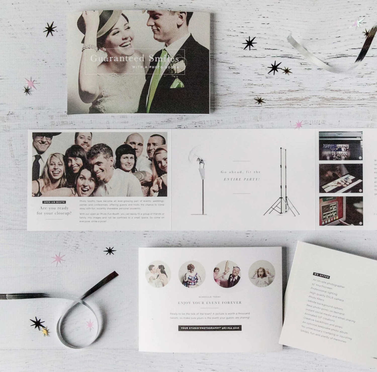 Use this handy 4.25×5.5 marketing trifold to show off your work and let clients know all the amazing features your photo booth offers.