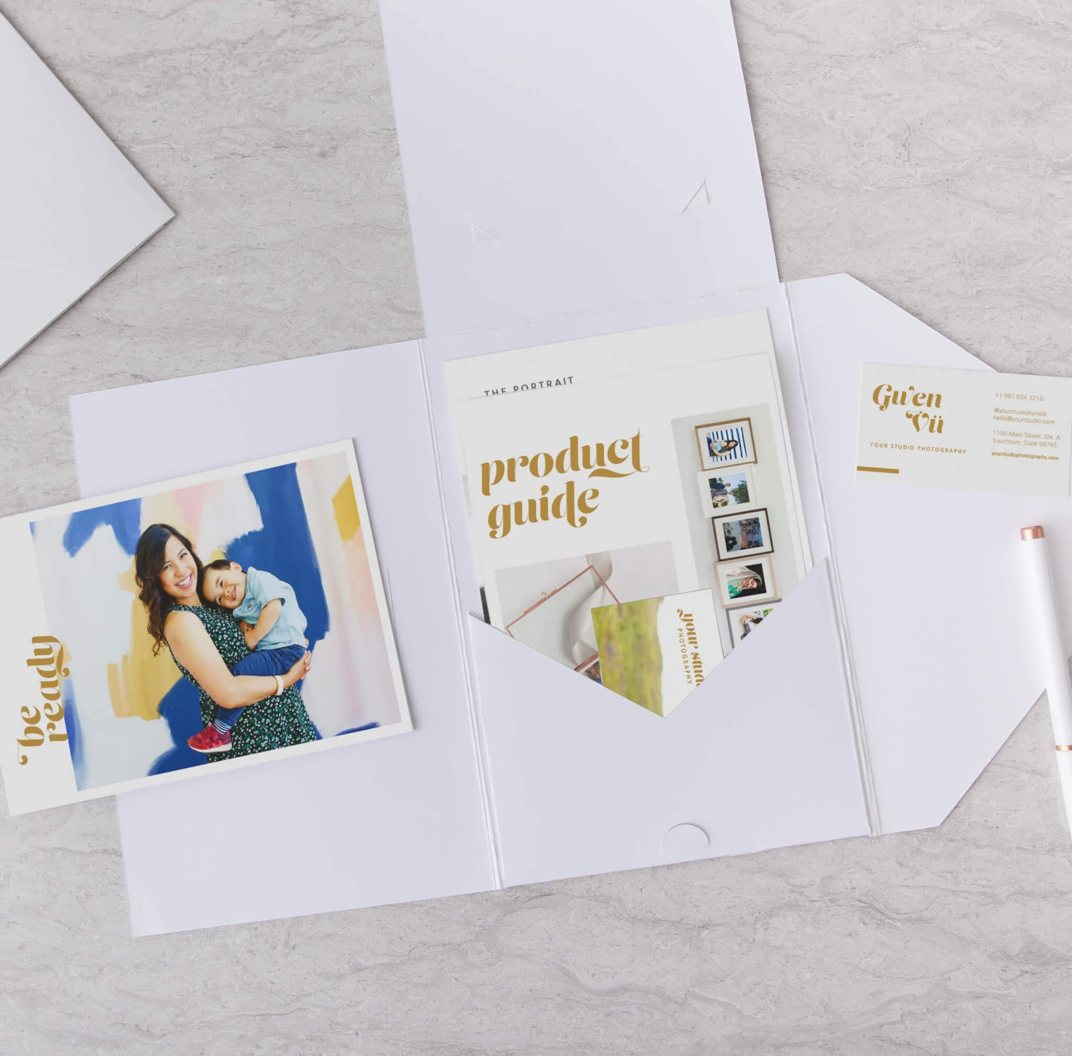 • Product Guide – 7×5 in, 4-panel, 2-sided folded card with pre-sized product mockups
