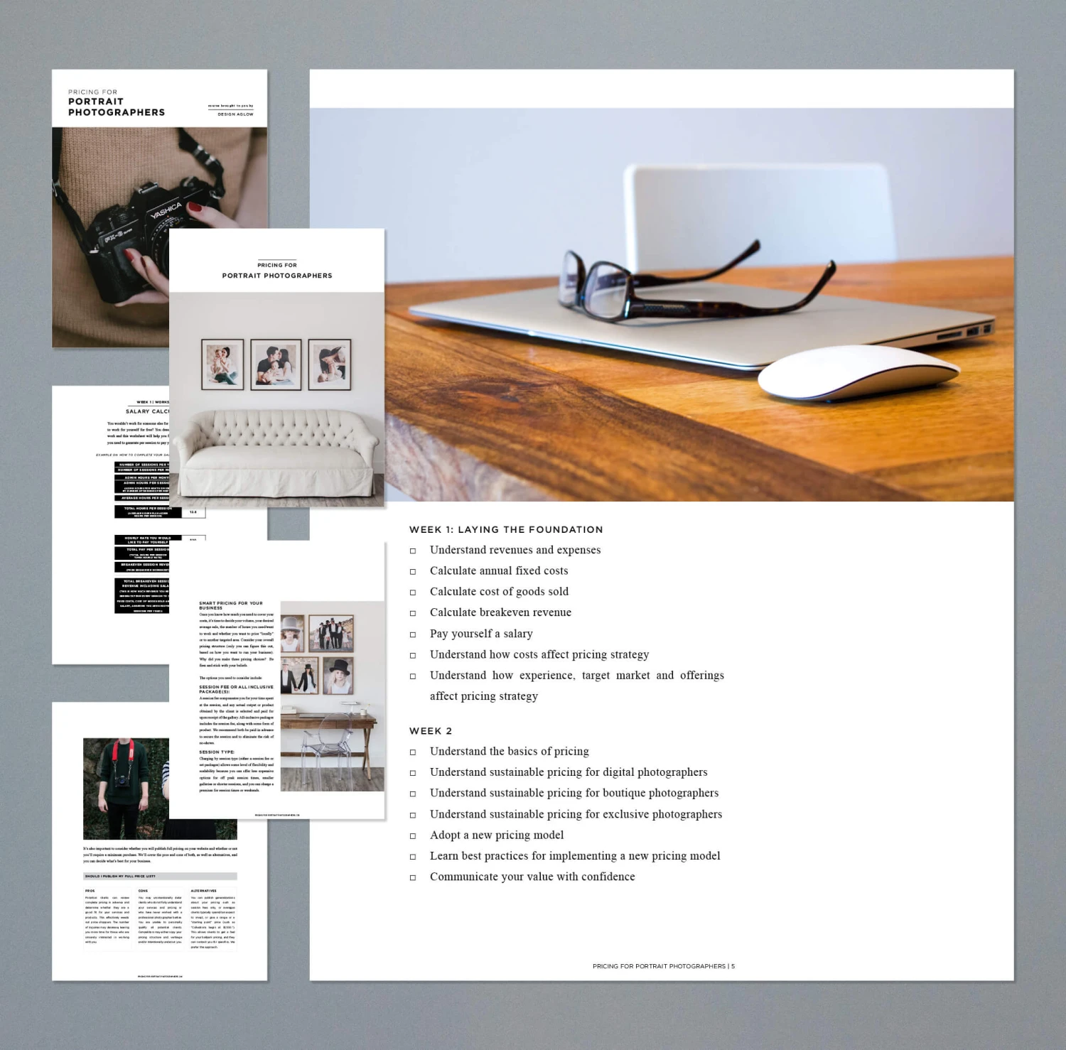• 60 pages of self-paced content filled with everything you need to create profitable, sustainable pricing for your portrait photography business.