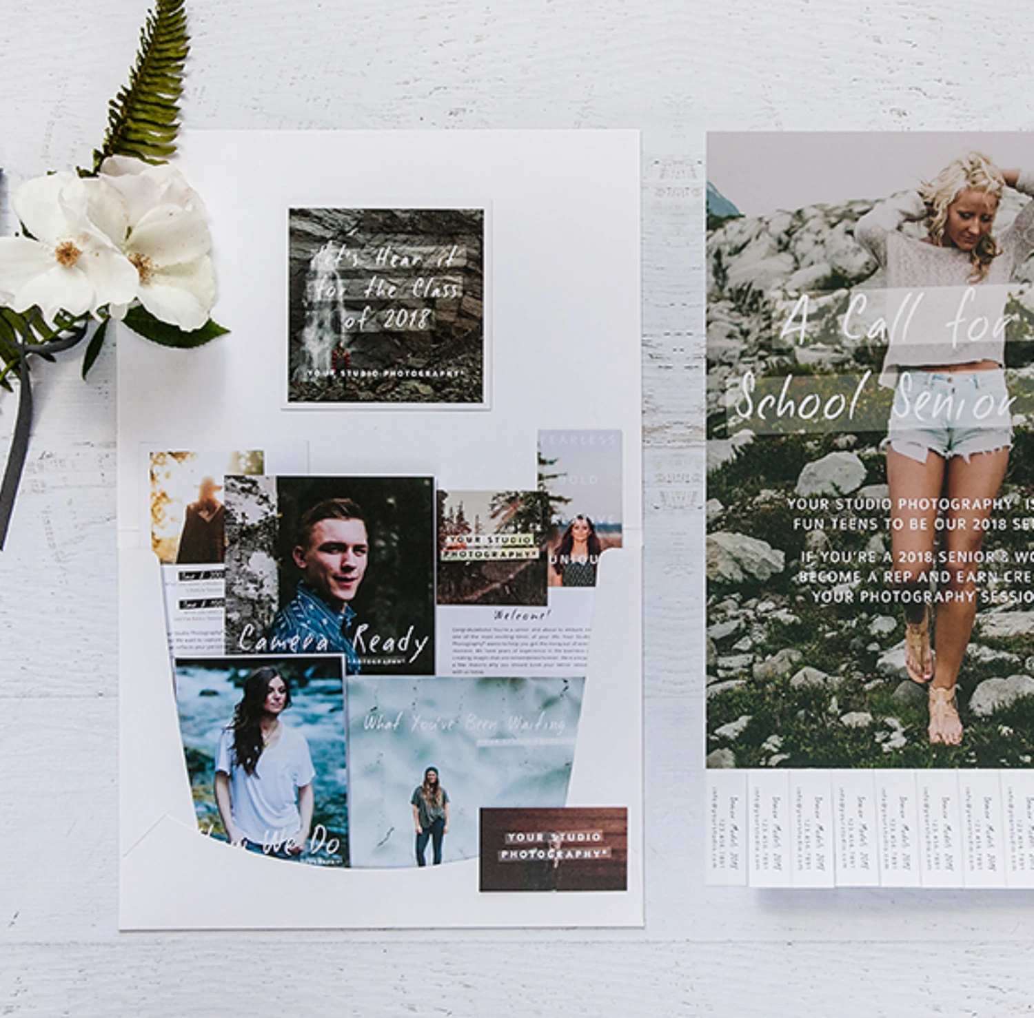 • General Studio Info Card: including packages, general session info, location session info, info about becoming a senior rep and testimonials (4×5.5 quad-fold)