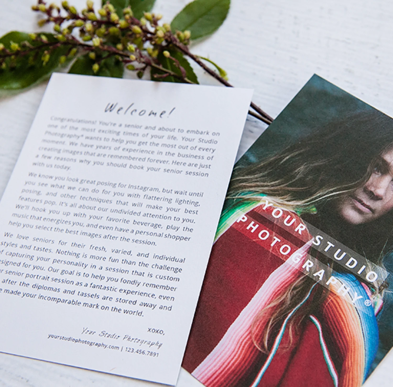 • Welcome Note: greeting defining the custom portraiture experience and your studio’s enthusiastic mission to exceed client expectations (4×5.5 flat note card)