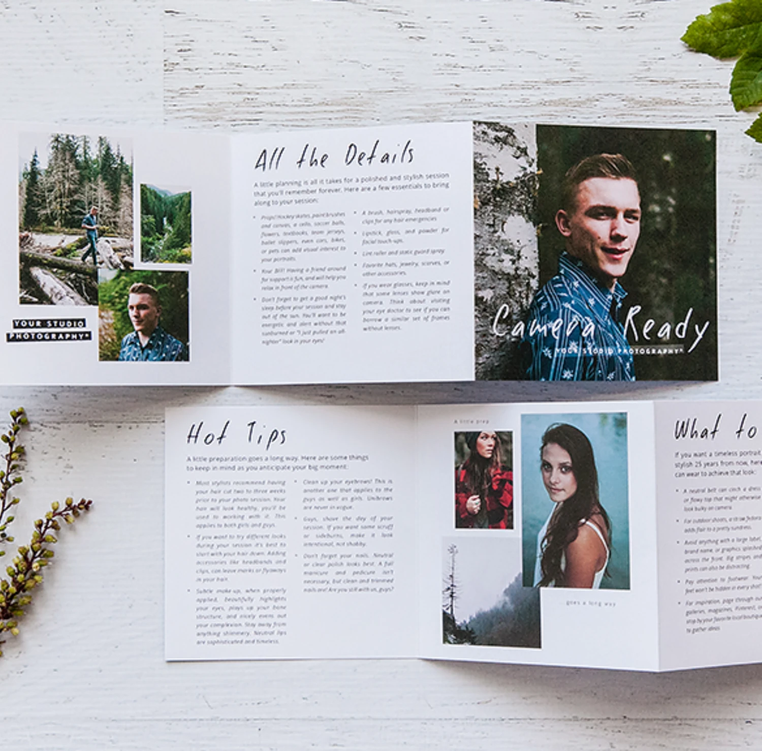 • Beauty Guide: with helpful tips for makeup, styling & clothing and checklist of items to remember leading up to their session (5×5 tri-fold card)