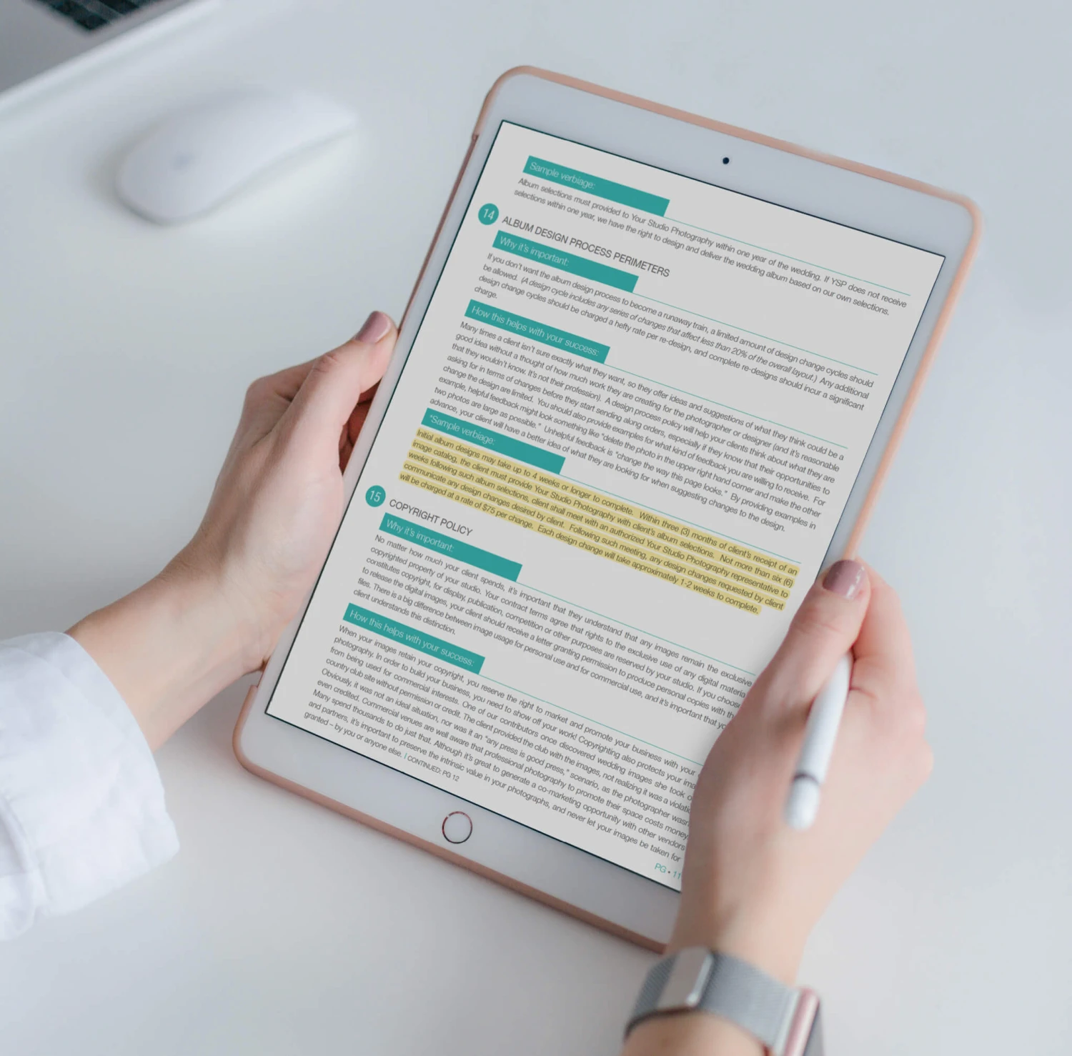 Possibly the single most valuable resource for any Wedding Photographer, our Essential Wedding Studio Policies for Success is a comprehensive guide to the implementation of policies and client relations. Elevate your business practices, create a superior impression for your customers and solidify a foundation for the utmost success in your craft.