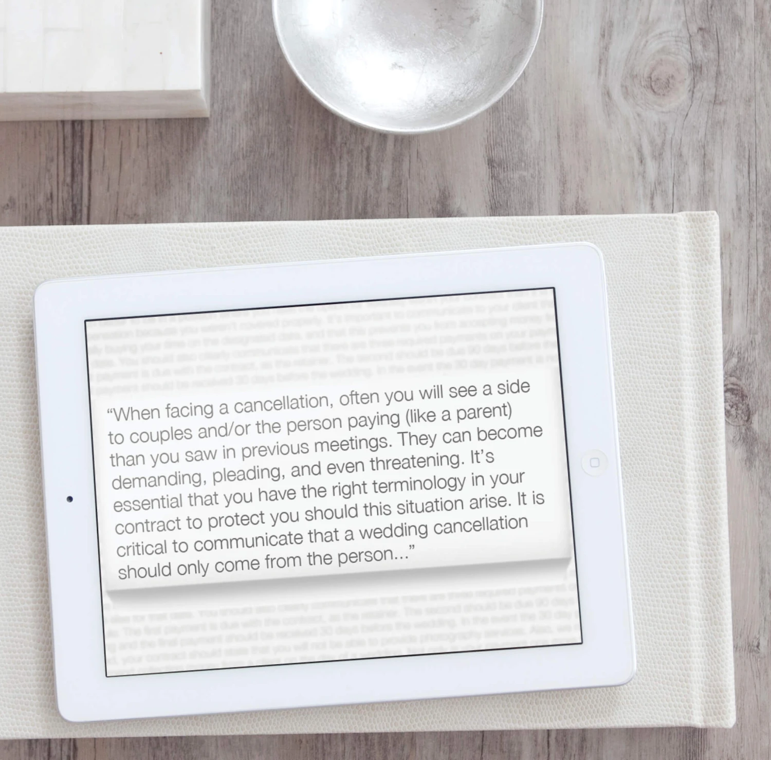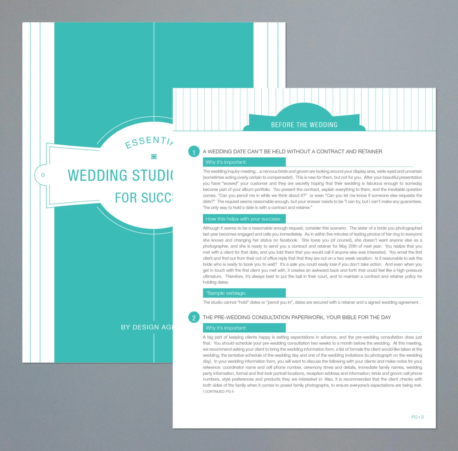 Learn the best practices for challenges like wedding cancellation protocol, pre-handling potential pricing issues, clarifying smart image delivery policies and even avoiding common wedding studio disasters. 15 key topics provide essential procedural information for before, during and after the wedding.
